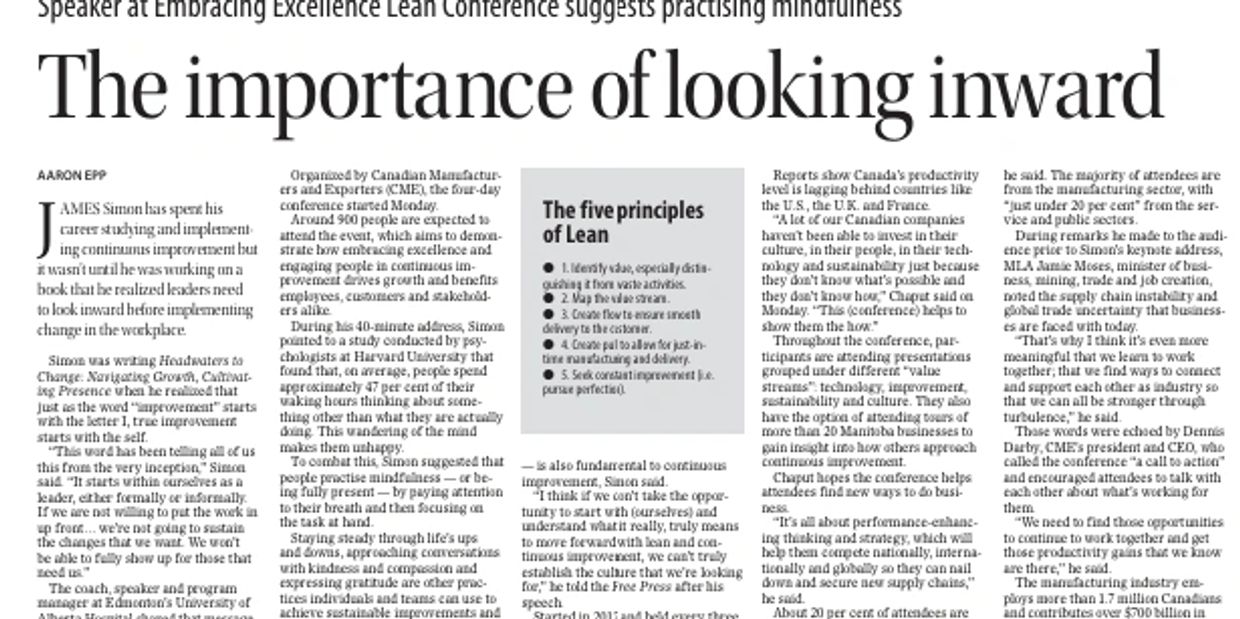 CLICK IMAGE TO VIEW ARTICLE: The importance of looking inward Speaker at Embracing Excellence Lean Conference suggests practicing mindfulness
